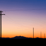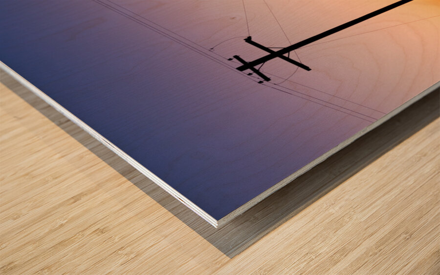 A minimalist photograph capturing the calm of a desert sunset near Winslow, Arizona, along Route 66. With the sun gone, the sky glows in warm orange, yellow, and purple hues, creating a peaceful atmosphere. Telegraph poles recede into the distance, their silhouettes standing stark against the fading light. A great photograph for those who appreciate the simplicity and beauty of the American Southwest.