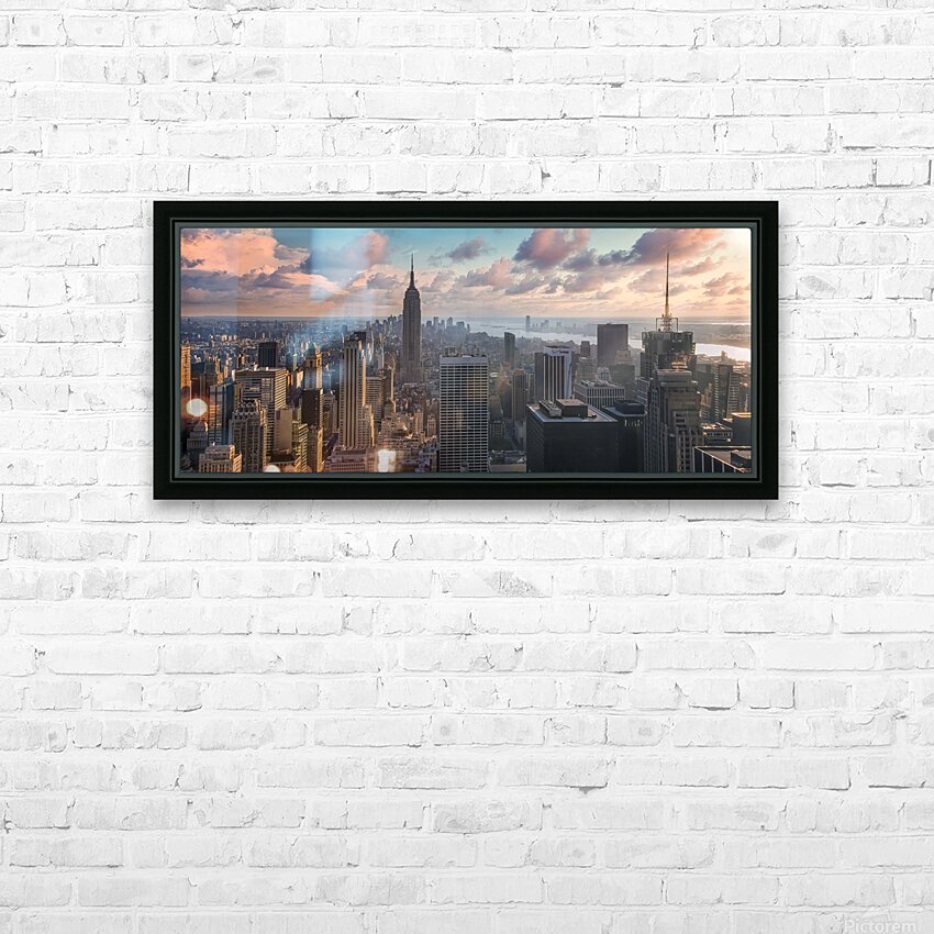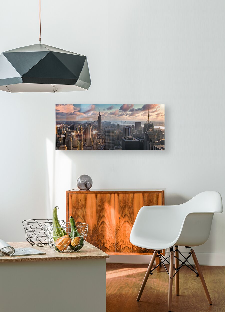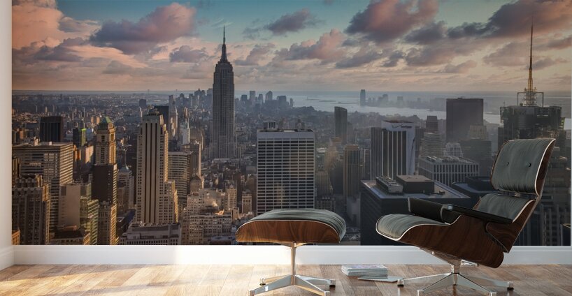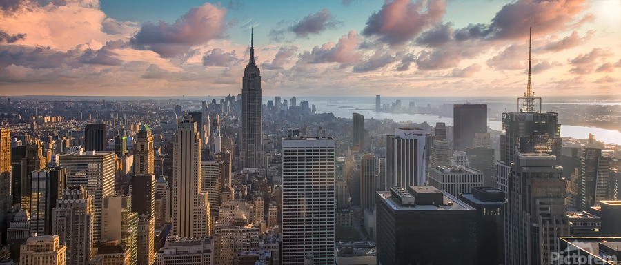 A panoramic aerial view of Manhattan at sunset looking south with the Empire State Building at its heart. The scene glows with warmth as the sun’s r...[+]