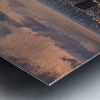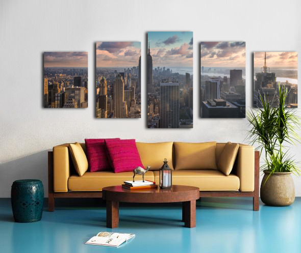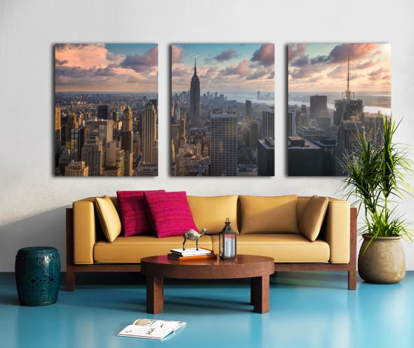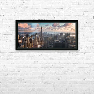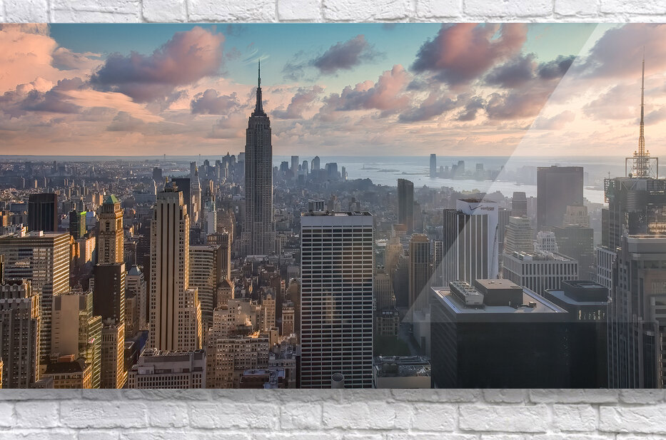 A panoramic aerial view of Manhattan at sunset looking south with the Empire State Building at its heart. The scene glows with warmth as the sun’s rays pierce through scattered clouds their edges catching the golden light. Stretching toward the horizon the citys iconic skyline unfolds in all its grandeur framed by the soft hues of the fading day. A perfect photograph for capturing the elegance and energy of New York at its most serene and majestic.