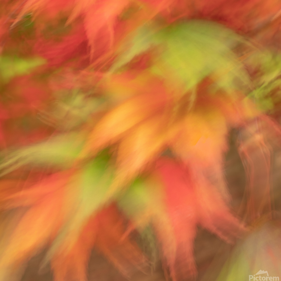 An abstract photograph of autumn leaves transformed into a vivid blend of motion and colour through intentional camera movement. Shades of yellow red ...[+]