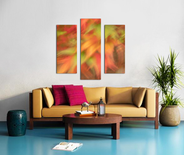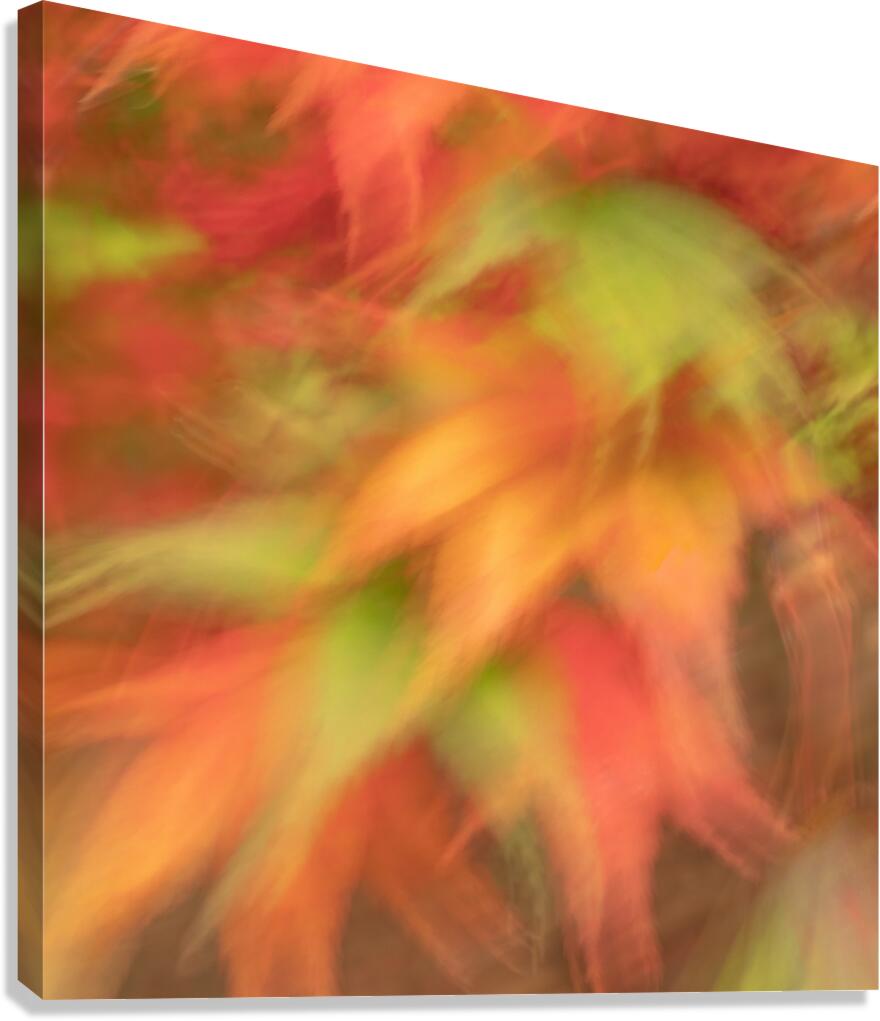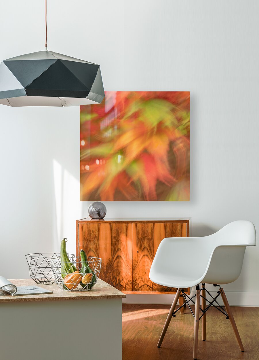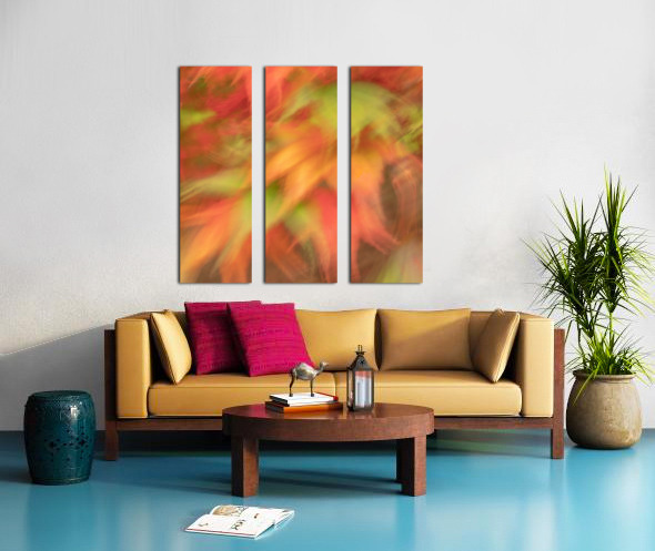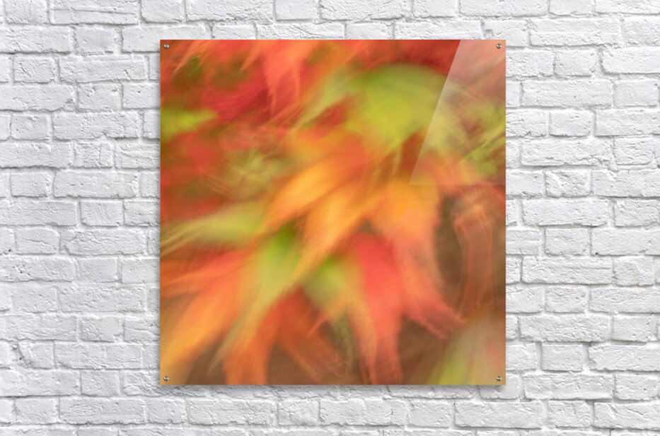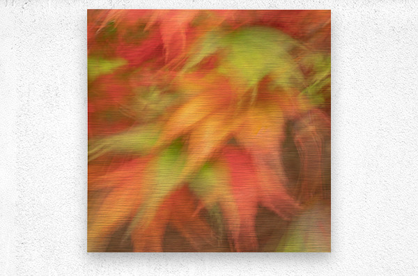 An abstract photograph of autumn leaves transformed into a vivid blend of motion and colour through intentional camera movement. Shades of yellow red orange and green merge in a dance of light and form evoking the fleeting beauty of autumn. A perfect photograph for those who love dynamic nature-inspired art that captures the essence of the season in an expressive modern way.