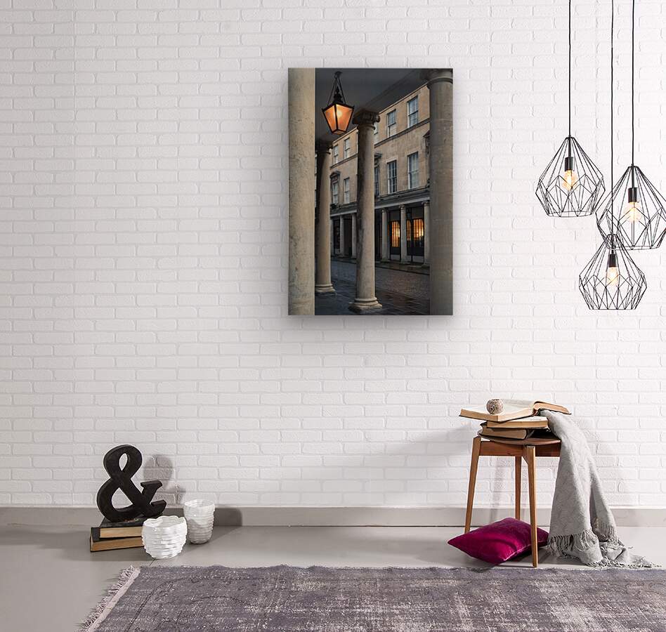 An early evening photograph of Bath Street in Bath Somerset where the iconic Georgian colonnades designed by Thomas Baldwin in 1791 frame the scene. The cool blue tones of dusk set a tranquil mood beautifully contrasted by the warm glow of a Victorian lantern and the illuminated front of a shop. This contrast brings the street’s historic charm to life showcasing the elegance of its architecture and the timeless atmosphere of one of Bath’s most famous streets. A perfect photograph for admirers of Baths architectural heritage and and historic urban streets.