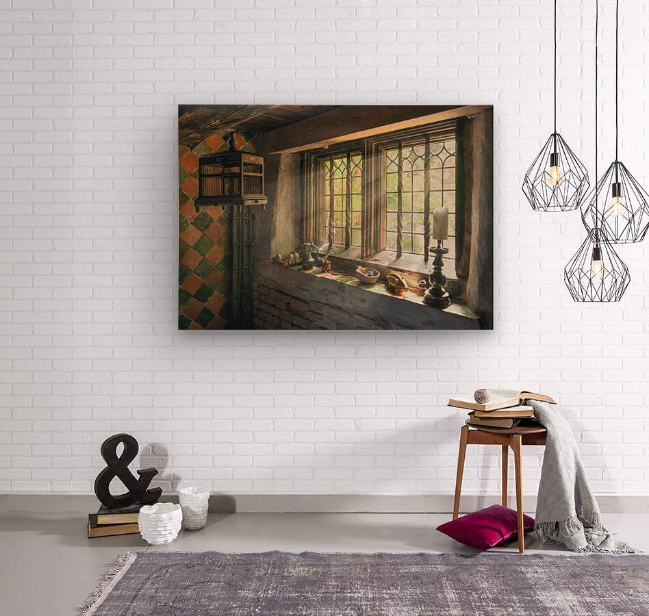 Sunlight streams through a mullioned window in a rustic room of an old Dutch house in Leiden Netherlands. The light catches a vintage birdcage hanging...[+]