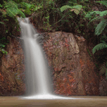 A waterfall cascades over textured rock in a tropical forest in Malaysia its flow softened to a silky blur. Framed by dense foliage the scene captures...[+]