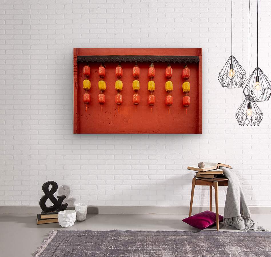 Red and yellow Chinese lanterns hang in front of a red wall in Ipoh Malaysia creating a vibrant display of colour and tradition. Their delicate forms stand out against the bold backdrop evoking the cultural charm of this historic town. A great photograph for those with an appreciation for Southeast Asian heritage and decorative details.