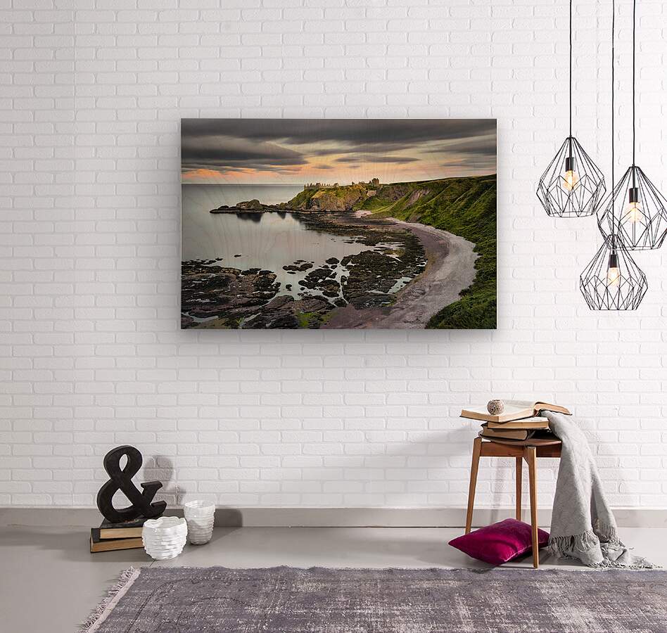 Dunnottar Castle stands resilient on its clifftop perch in Aberdeenshire as the last light of day casts a warm glow across the sky. Heavy clouds gather overhead hinting at approaching rain while the rugged coastline stretches toward the fortress from the Stonehaven side. The atmosphere is both dramatic and timeless capturing the wild beauty and storied past of this historic stronghold. A great photograph for those who admire Scotland’s coastal landscapes and ancient landmarks.