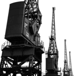 A monochrome photograph of vintage cargo cranes at Bristol Port England their striking shapes outlined against a pale sky almost forming a silhouette....[+]