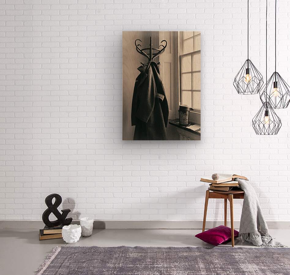 A WW2 RAF greatcoat hangs from a vintage coat stand its heavy folds catching the soft light from a nearby window. On the ledge a well-used Thermos Flask rests in quiet stillness hinting at moments of warmth in a colder time. The scene feels like a glimpse into the past evoking the resilience and routines of a bygone era. A great photograph for those drawn to history nostalgia and the quiet stories objects can tell. ..... Please Note: This image is intentionally presented with a grainy texture as part of its aesthetic.