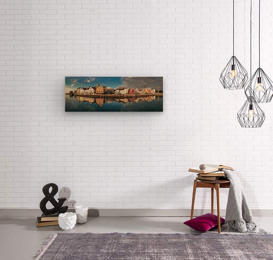 A panoramic view of Stavanger’s seafront captured just before sunset as warm light settles over the harbour. The waterfront houses and buildings are mirrored in the still water creating a quiet balanced scene that blends natural calm with urban charm. A perfect photograph for those who appreciate coastal towns Scandinavian charm and the quiet beauty of waterfront views.