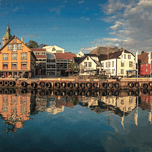 A panoramic view of Stavanger’s seafront captured just before sunset as warm light settles over the harbour. The waterfront houses and buildings are mirrored in the still water creating a quiet balanced scene that blends natural calm with urban charm. A perfect photograph for those who appreciate coastal towns Scandinavian charm and the quiet beauty of waterfront views.