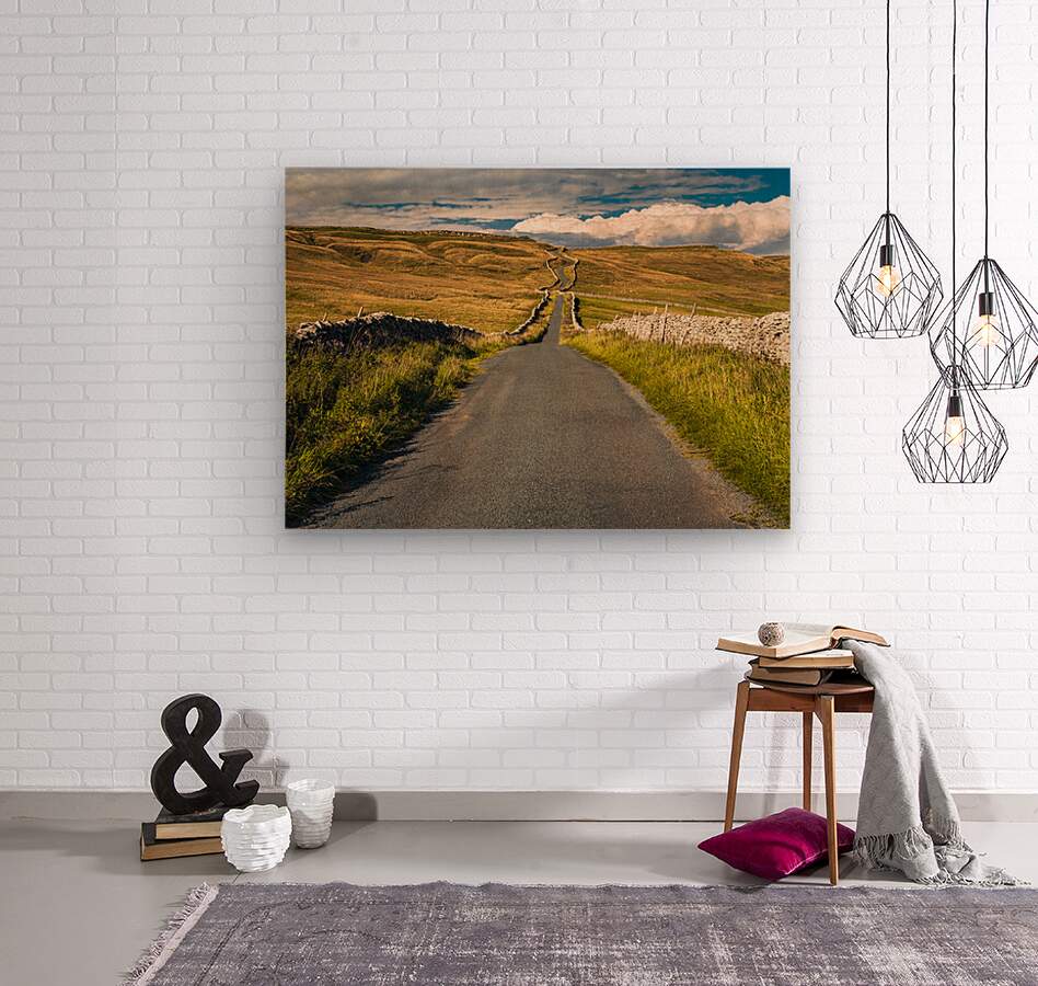 A quiet road winds through the Yorkshire Dales on a bright sunny day flanked by rustic stone walls that guide the eye toward the horizon. The mix of blue sky and drifting cloud adds depth to the open landscape capturing the charm and simplicity of rural England. A perfect photograph for those who love peaceful countryside scenes and the timeless appeal of the Dales.