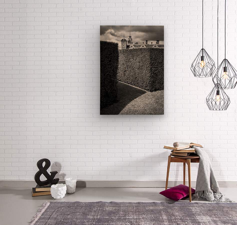 Tall perfectly shaped garden hedges dominate the scene at Blickling Estate in Norfolk their sculpted forms casting deep shadows across the lawn. Just visible above the hedge line the rooftop of the historic house hints at the grandeur beyond. Overhead dark clouds gather adding weight and atmosphere to this carefully tended landscape. A great photograph for those who appreciate the quiet drama of English heritage gardens and the contrast between order and nature.