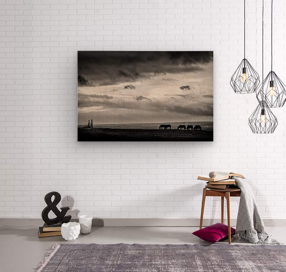 Silhouetted Icelandic horses stand quietly at days end near Hvammstangi their forms small against the vast open landscape. Heavy clouds hang low above adding weight to the scene and a sense of stillness as light fades. A perfect photograph for those drawn to Iceland’s raw beauty and the quiet connection between animal and land.