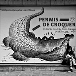 A young woman is seated in front of a billboard-sized poster on a Paris street reading a book. Behind her a cartoon image of a crocodile dominates an ...[+]
