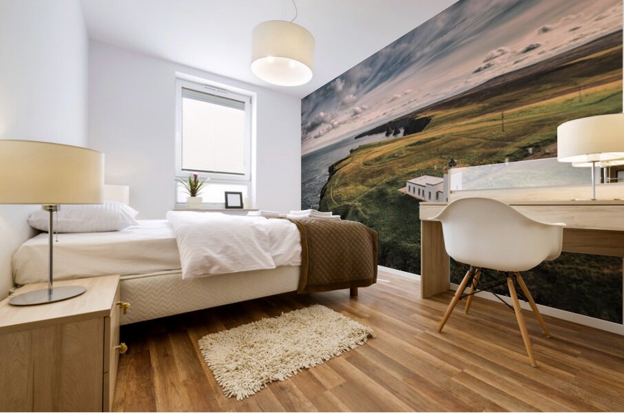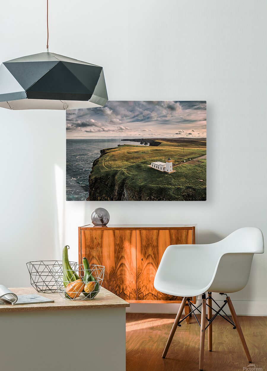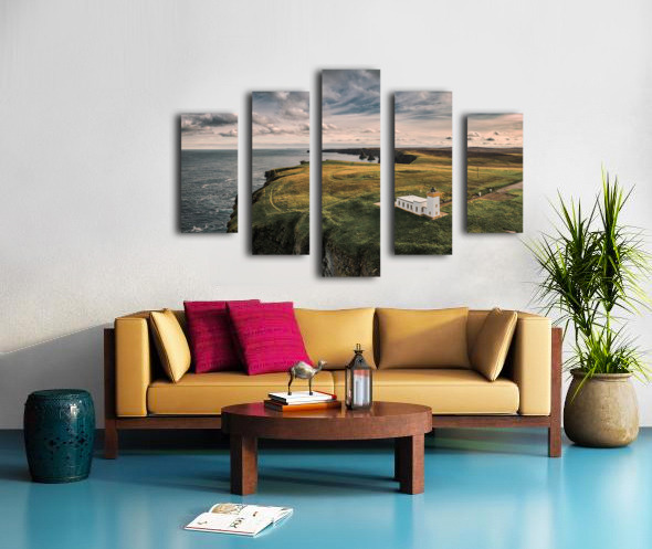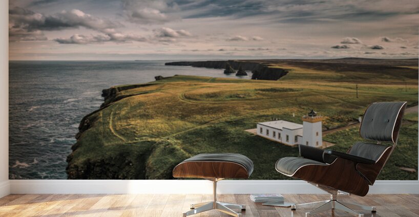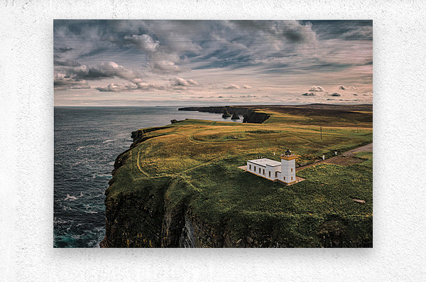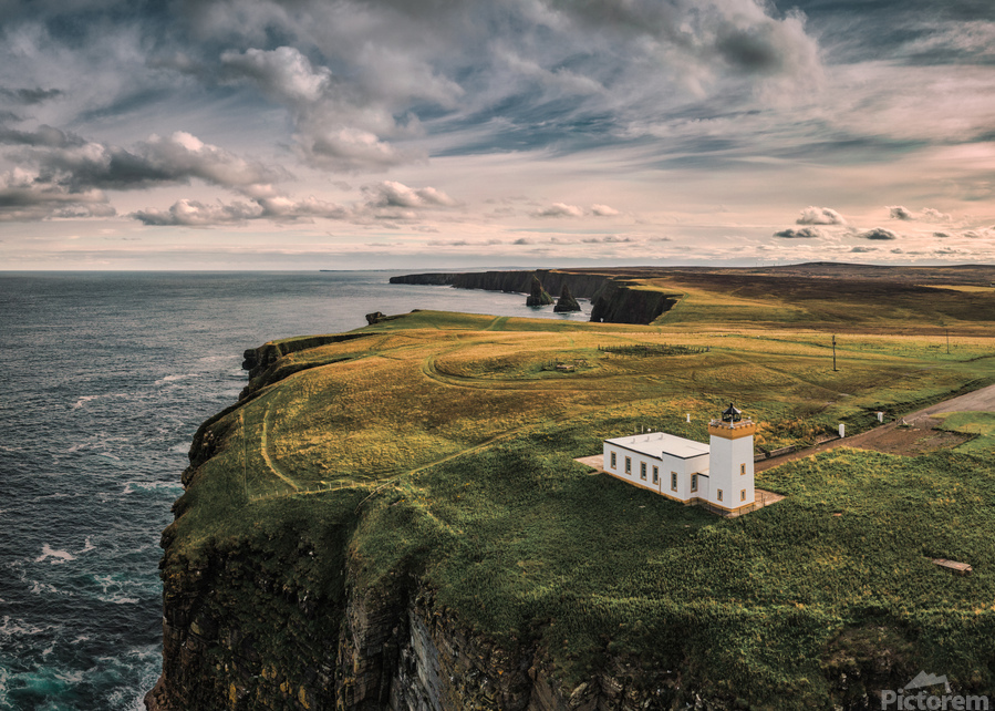 An aerial view of Duncansby Head Lighthouse near John o’ Groats in Caithness Scotland with towering cliffs and a dramatic sky completing the scene. Perched on the northeastern tip of mainland Britain the lighthouse stands as a striking landmark amid the rugged coastal landscape. Duncansby Head marks one of the most remote and windswept points on the Scottish mainland. The lighthouse has guided vessels through the Pentland Firth since 1924 standing watch over fast-moving tides and treacherous waters. Beyond its function the headland is known for its sea stacks wild seabird colonies and expansive views across to the Orkney Islands making it a destination for both photographers and travellers seeking solitude at the edge of the land. This image is available as wall art and across a broad range of print-on-demand formats from home decor to lifestyle accessories. Ideal for those drawn to remote coastal scenes and the dramatic beauty of northern Scotland.