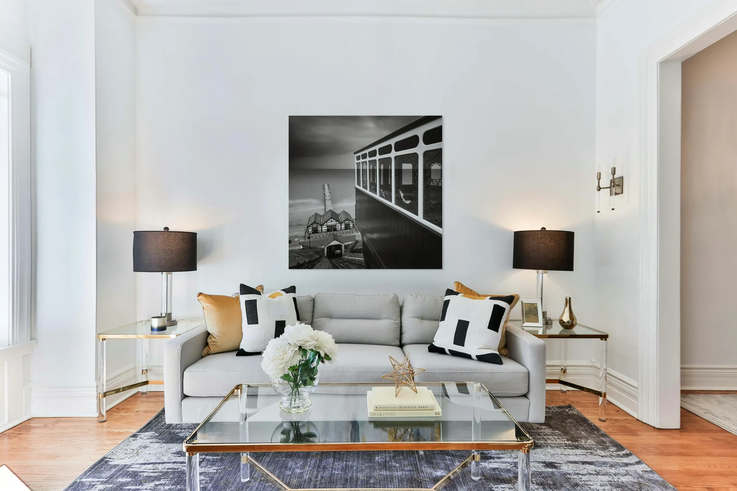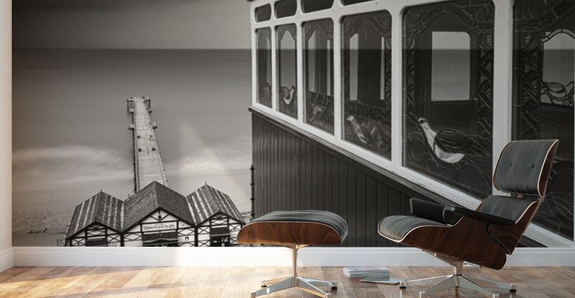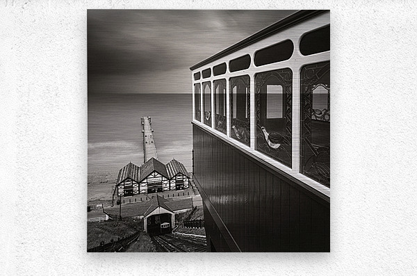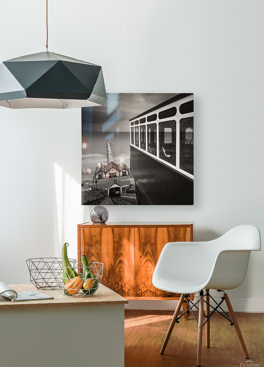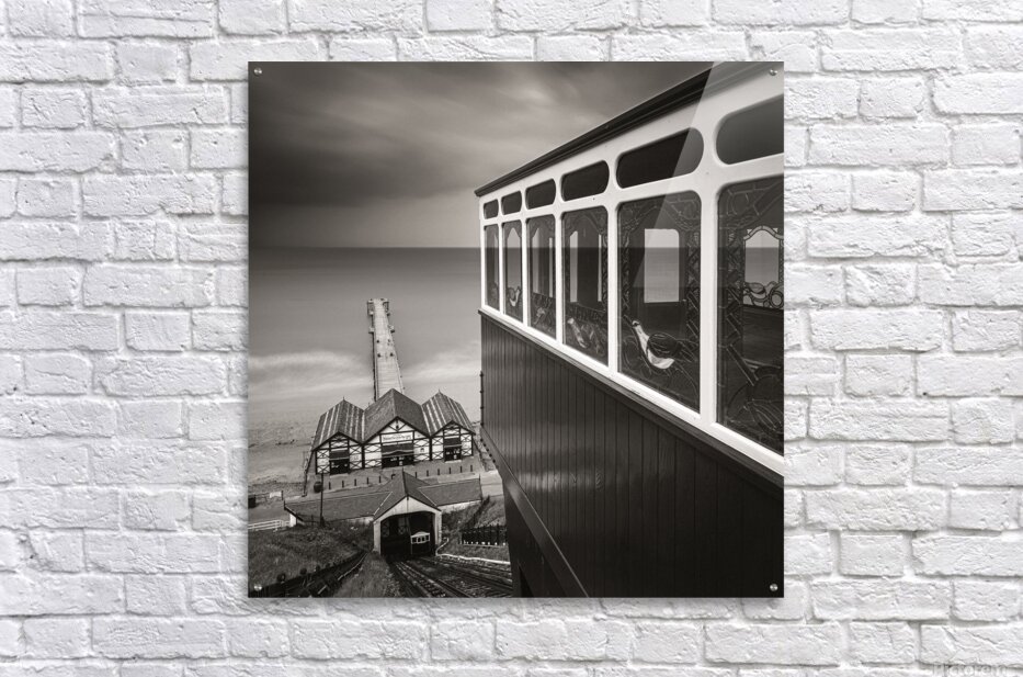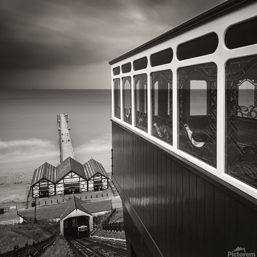 A view from the top of the Saltburn Cliff Tramway looking down towards the pier and the North Sea beyond. The scene is framed by one of the tram carriages to the right its polished wooden panels and decorative stained glass windows adding intricate detail in contrast to the open expanse of water and sky. Below the tracks descend steeply towards the station and the pier stretching out into the calm sea. Located in Saltburn-by-the-Sea North Yorkshire the tramway is Britain’s oldest water-balanced cliff lift in operation since 1884. This stretch of coastline blends Victorian elegance with the raw beauty of the North Sea where shifting light and weather patterns create an ever-changing backdrop. Standing here there’s a tangible sense of stepping into another era—one shaped by seaside holidays promenades and the romance of travel by rail and sea. Perfect for lovers of coastal heritage nostalgic architecture and atmospheric seascapes this piece makes a striking statement in any setting from contemporary interiors seeking a focal point to traditional spaces celebrating Britain’s maritime past.