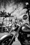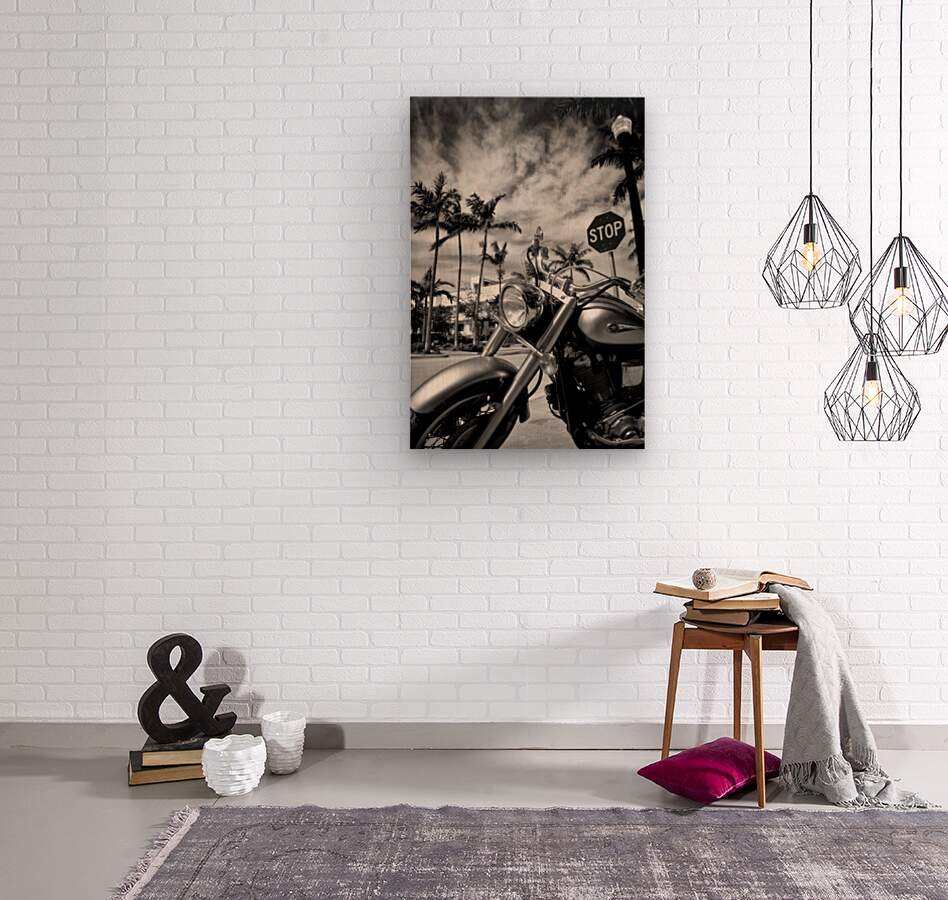 A low rider-style motorbike is parked on South Beach in Miami its silver paint and chrome gleaming under the bright sun. Palm trees line the background a stop sign marks the edge of the scene and a sky full of scattered clouds completes the vibrant sunny setting. South Beach is known for its lively atmosphere and iconic coastal streets. The low rider style of the motorbike reflects the playful and expressive culture of the area where customised vehicles and beachside style are a natural fit for the surroundings. This image captures both the style of the motorbike and the iconic atmosphere of Miami’s South Beach making it a visually striking and dynamic piece for any wall. This image is available as wall art and across a wide range of formats to suit your space or style.