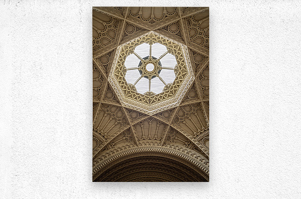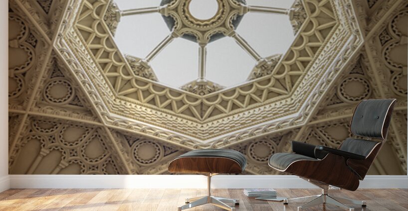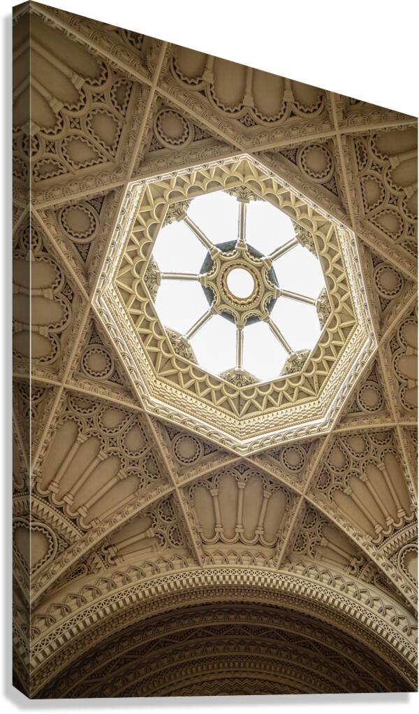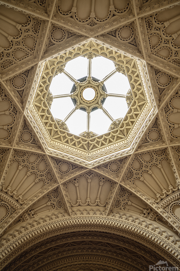 The ornate and intricately detailed ceiling above the Grand Staircase inside Penrhyn Castle near Bangor in North Wales. The view looks up into an octagonal skylight framed by elaborate Gothic Revival stonework where repeating patterns arches and sculpted details converge in a striking display of craftsmanship. The rich geometry and precise symmetry create a dramatic architectural study highlighting the opulence and ambition of 19th-century design. It’s a perspective that draws the eye upward celebrating the artistry and structural mastery behind one of the castle’s most impressive interiors. This image is available as wall art and across a wide range of formats to suit your space or style.