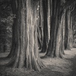 A quiet grove of trees stands in soft monochrome light their trunks forming gentle curves that lead the eye through the scene. The textures of the bar...[+]