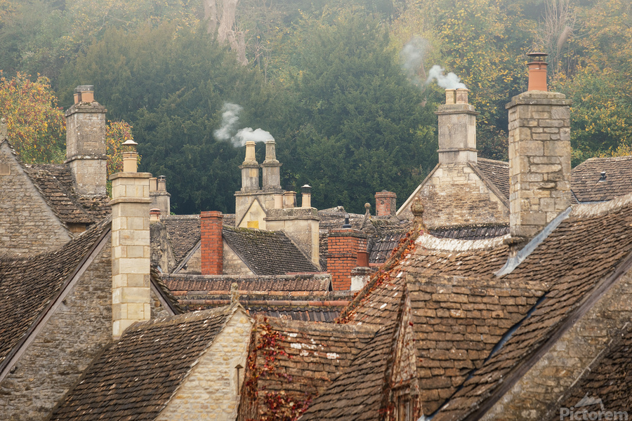 Soft smoke curls from the chimneys of Castle Combe’s stone cottages drifting into the still morning air above a patchwork of tiled rooftops. The warm tones of the stone and the rhythmic rise of chimney stacks capture the timeless charm of this historic English village. The subtle haze and depth of texture evoke a peaceful sense of place and tradition. Located in Wiltshire Castle Combe is often described as one of the most beautiful villages in England. Its origins date back to the medieval period with many of its buildings constructed from locally quarried stone preserving an authentic glimpse of Cotswold architecture and heritage. A perfect photograph for admirers of English countryside charm and traditional architecture. This image is available as wall art and across a wide range of formats to suit your space or style.