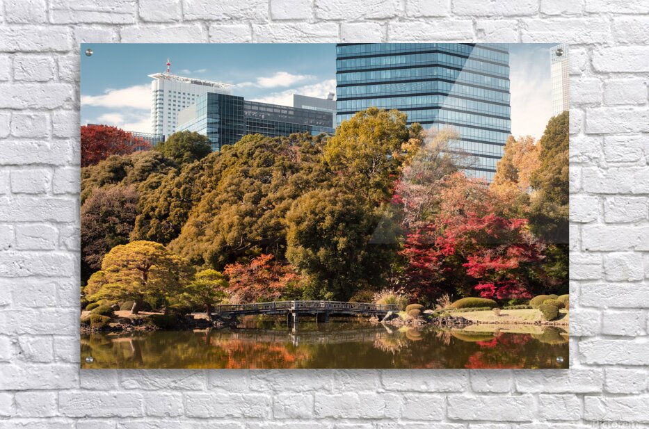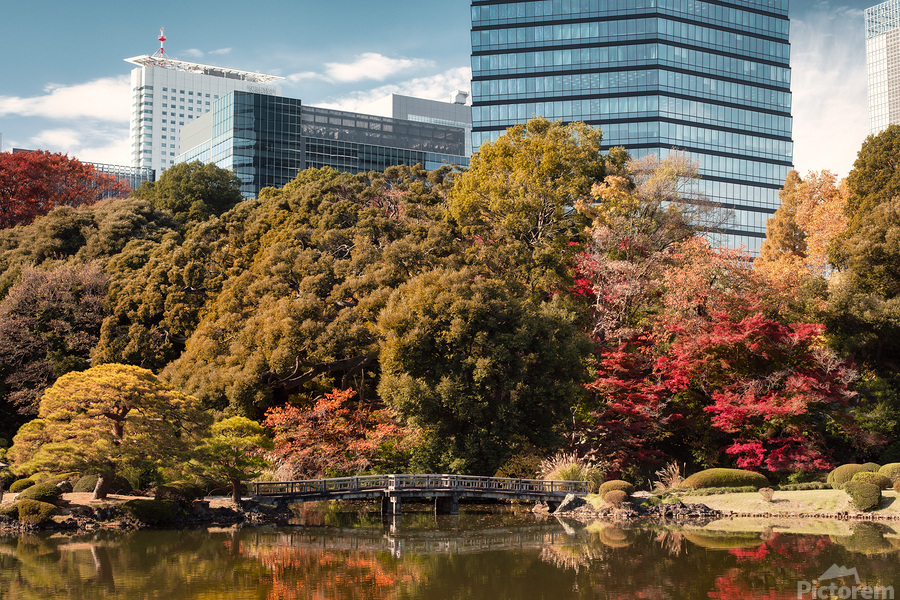 Autumn colour gathers quietly around the pond at Shinjuku Gyoen where layered trees shift from green to gold and deep red. Reflections settle on the water’s surface softening the scene and allowing the garden to breathe even as the city rises just beyond the frame. There is a sense of pause here a moment where nature holds its ground amid the surrounding geometry of Tokyo. Shinjuku Gyoen National Garden is one of Tokyo’s most celebrated green spaces blending traditional Japanese landscaping with open lawns and carefully designed vistas. Once part of an imperial estate the garden now offers a rare sense of openness in the heart of the city. In autumn its varied tree species bring a richness of colour that contrasts naturally with the modern skyline behind. A perfect photograph for spaces that suit calm reflective imagery with a subtle urban edge. This image is available as wall art and across a wide range of formats to suit your space or style.
