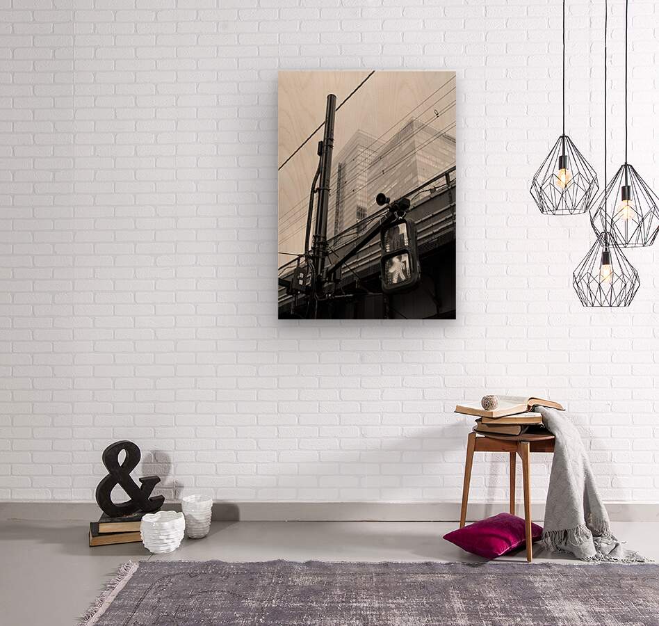 An illuminated pedestrian signal cuts through the darker tones of a street scene in Chiyoda City its bright figure standing out against the tangle of cables metal framework and shadowed structures around it. Behind the crossing light the glass towers near Tokyo Station rise softly into the background their forms partially diffused by the evening light. The contrast between the sharp signal and the layered city elements creates a clean striking urban moment. This photograph was taken close to Tokyo Station in Chiyoda City one of the capital’s busiest and most architecturally varied districts. The area combines historic rail infrastructure with modern office buildings overhead wiring and elevated roadways. Pedestrian signals like this are a familiar sight in central Tokyo guiding the constant flow of people through the city’s dense and highly organised street network. A perfect photograph for fans of black and white city photography minimalist urban scenes or modern architectural detail. This image is available as wall art and across a wide range of formats to suit your space or style.