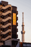 An evening view of Tokyo Skytree stands against a soft fading sky framed by nearby apartment buildings as daylight slips away. Warm lights along an ex...[+]