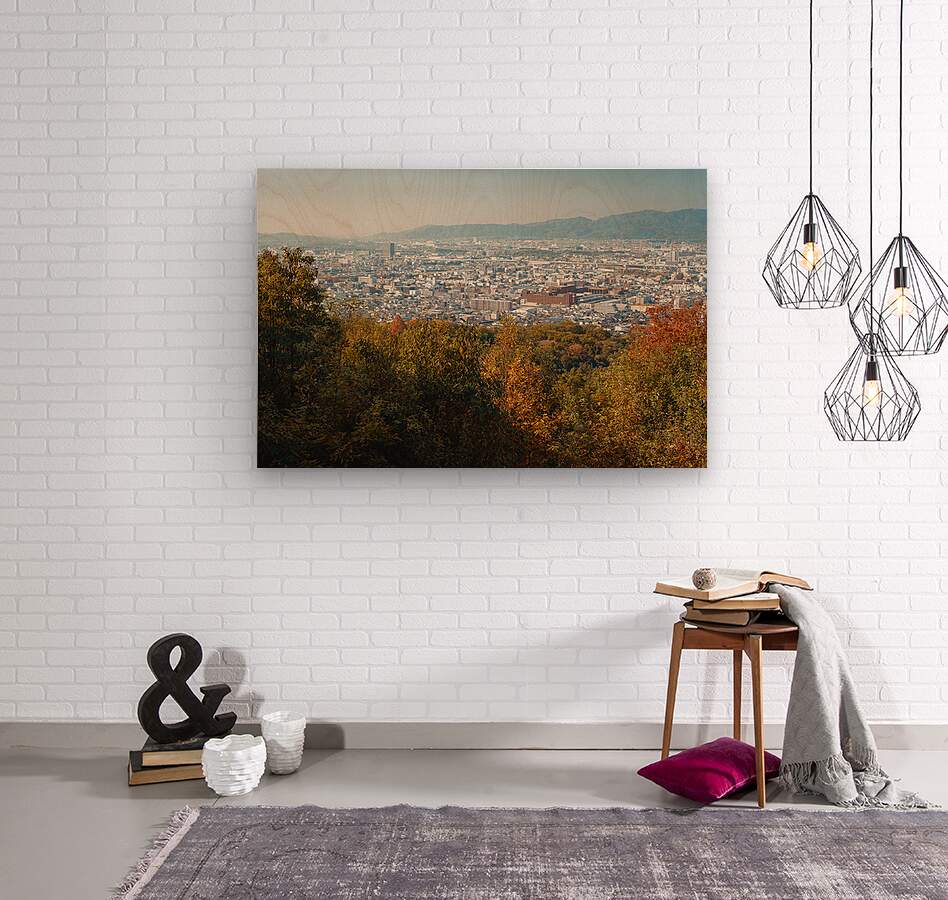 From high on the slopes of Fushimi Inari Taisha Kyoto’s dense cityscape stretches out toward the distant hills under a clear pale sky. In the foreground autumn leaves in shades of gold rust and deep green frame the view adding warmth and texture to the scene. The contrast between the soft colours of the trees and the tightly packed buildings below creates a calm balanced perspective on the city. Fushimi Inari Taisha is one of Kyoto’s most famous Shinto shrines known for its forested mountain trails and elevated viewpoints. From here visitors can look out across large sections of the city with the surrounding hills forming a natural backdrop. The changing seasonal colours highlight the way Kyoto blends urban life with its long-standing connection to nature. A perfect photograph for those who appreciate wide city views with a sense of place and season. This image is available as wall art and across a wide range of formats to suit your space or style.