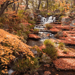 Autumn settles gently over Kokoen Garden as a shallow stream steps its way through stone channels scattered with fallen maple leaves in deep reds and warm oranges. The scene feels calm and balanced with water rock and foliage working together to create a quiet rhythm that invites the eye to slow down and linger. It is the kind of place that feels designed for reflection where nothing competes for attention and everything sits in harmony. Kokoen Garden sits beside Himeji Castle and is known for its carefully composed landscapes that change character with the seasons. In autumn the garden becomes especially rich in colour and texture with leaves gathering along the water’s edge and soft cascades guiding the flow downstream. The stepped layout of the stream draws the viewer naturally through the frame reinforcing the sense of order and intention that defines traditional Japanese garden design. This image works beautifully in spaces where a sense of calm and natural balance is valued from living rooms to offices or quiet corners meant for pause and reflection. This image is available as wall art and across a wide range of formats to suit your space or style.