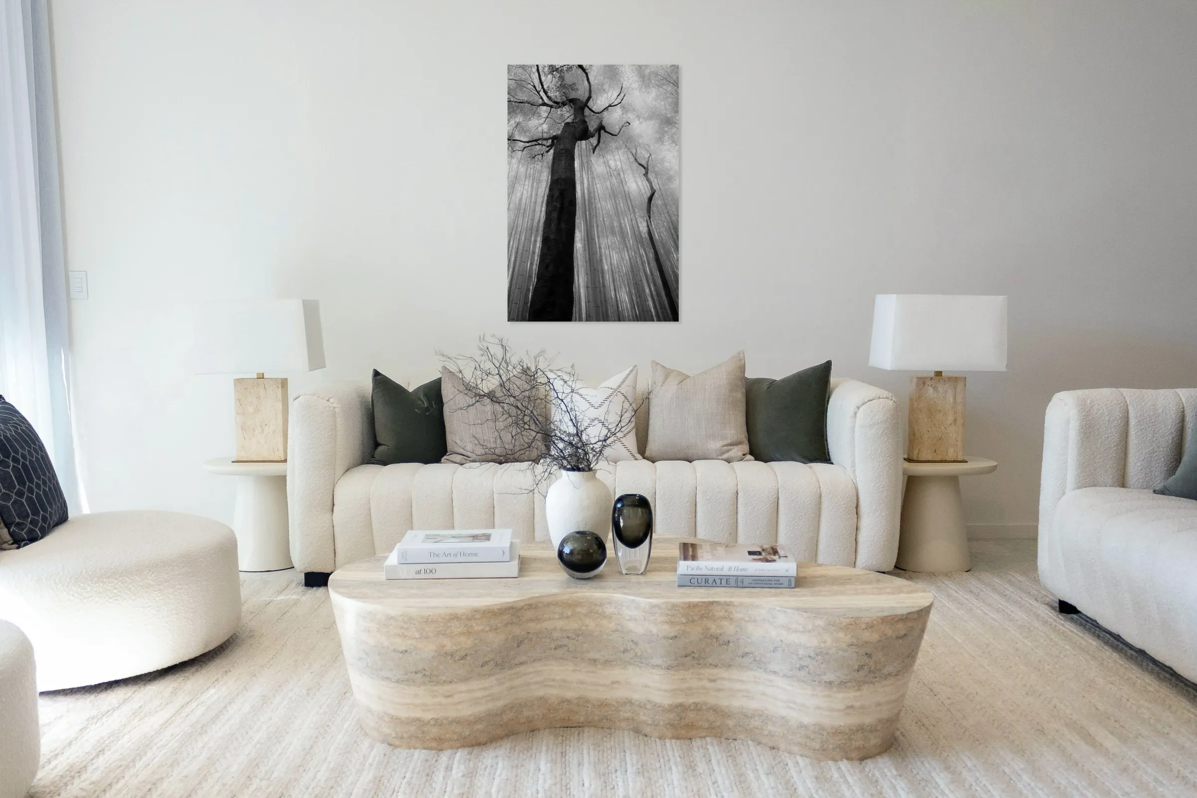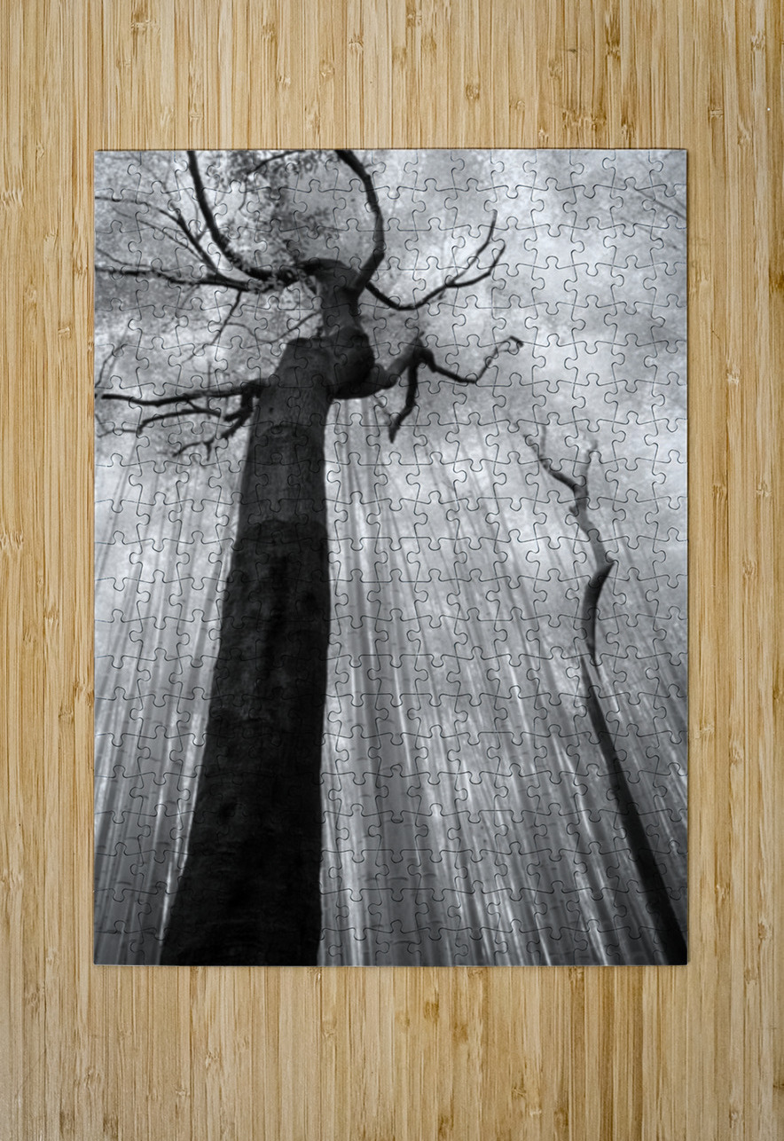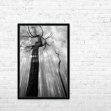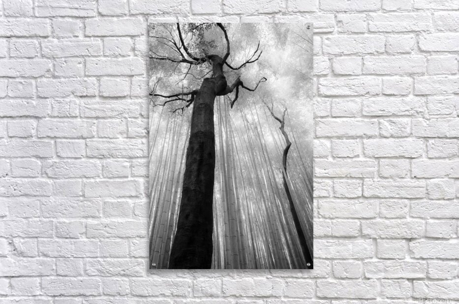 Two dark trees rise through the Arashiyama Bamboo Forest in Kyoto their heavy trunks and twisting branches breaking the strict vertical rhythm of the bamboo around them. The space between these forms creates a quiet pause in the scene a moment of separation and stillness where the eye can rest. This sense of gap and restraint gives the image its tension and calm inviting the viewer to linger in what is not filled as much as what is present. Arashiyama Bamboo Forest is one of Kyoto’s most recognisable landscapes known for its dense stands of bamboo that create a strong sense of repetition and scale. The presence of these trees interrupts that pattern highlighting the natural variation within the forest and reminding viewers that the landscape is shaped by time rather than uniform design. A perfect photograph for interiors that benefit from strong natural forms and restrained composition. This image is available as wall art and across a wide range of formats to suit your space or style.