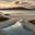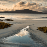 Seilebost Beach at sunset on the Isle of Harris, Outer Hebrides, Scotland. The scene captures the peaceful beauty of the beach, where a small stream meanders across the sand, tracing intricate ripples left by the receding tide. The warm glow of the setting sun casts a soft light over the landscape, highlighting the natural textures of the beach and surrounding scenery. A perfect photograph for those who appreciate the calm of coastal landscapes and the timeless beauty of Scotland’s shores.