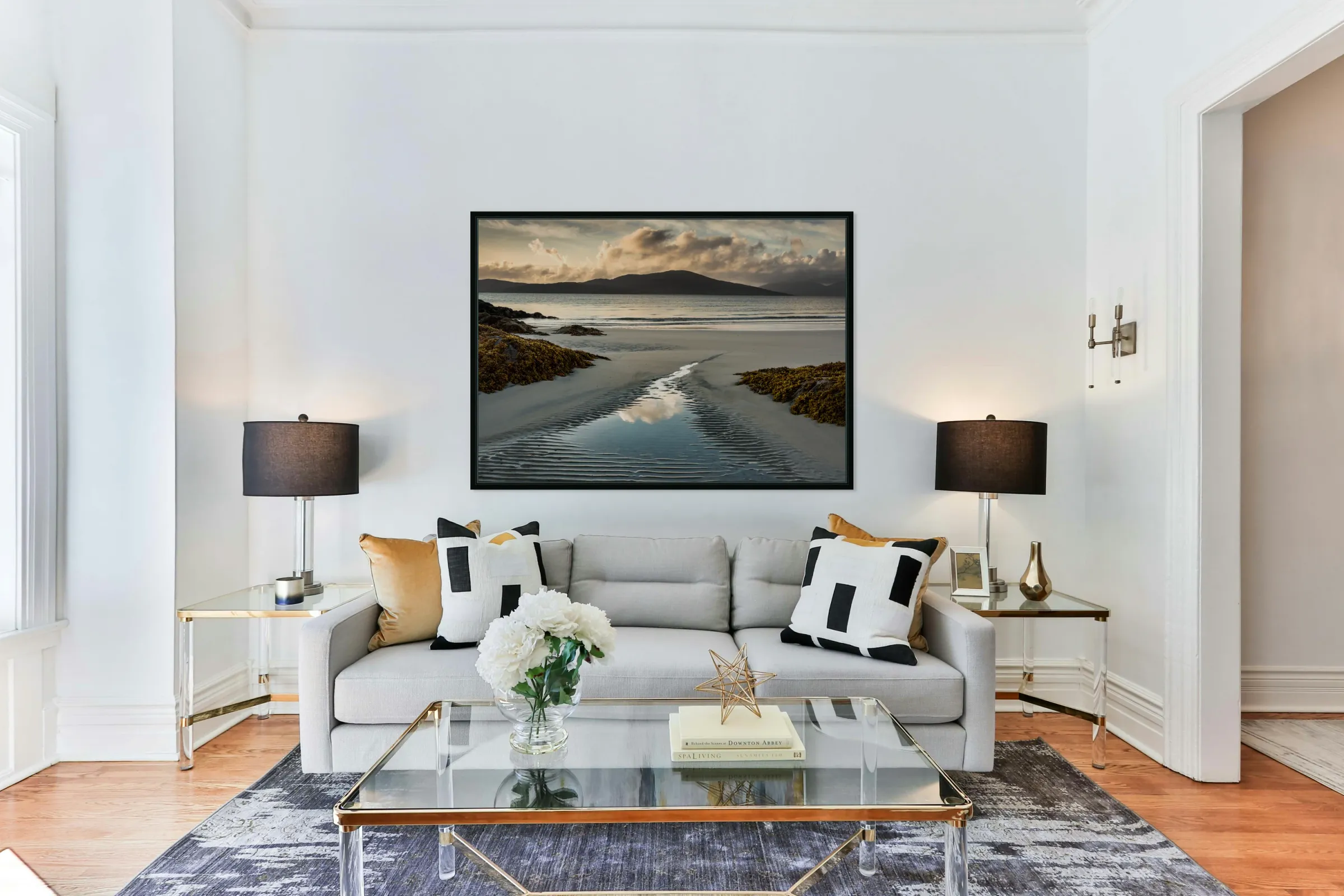 Seilebost Beach at sunset on the Isle of Harris, Outer Hebrides, Scotland. The scene captures the peaceful beauty of the beach, where a small stream meanders across the sand, tracing intricate ripples left by the receding tide. The warm glow of the setting sun casts a soft light over the landscape, highlighting the natural textures of the beach and surrounding scenery. A perfect photograph for those who appreciate the calm of coastal landscapes and the timeless beauty of Scotland’s shores.