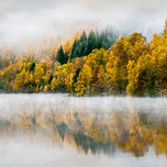 A serene photograph capturing low-lying autumn mist on the River Tummel in Perth and Kinross, Scotland. Vibrant autumn trees display rich, colorful fo...[+]