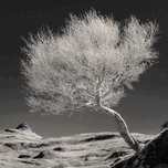 A windswept tree leans from a rocky slope in the Northwest Highlands of Scotland, its trunk curving toward open moor while the peak of Stac Pollaidh sits on the horizon. A dense crown of fine branches spreads like lace against a dark sky, and the pale ground rolls away in soft ridges and hollows. Stac Pollaidh is one of the Highlands’ most distinctive hills, a landmark that anchors this wild landscape. Presented in infrared monochrome, the scene draws crisp detail from the tree and deepens the sky, giving the view a calm, otherworldly clarity that suits the rugged setting. This image will appeal to anyone who loves sculptural trees, strong contrasts, and Highland drama. This image is available as wall art and across a wide range of formats to suit your space or style.