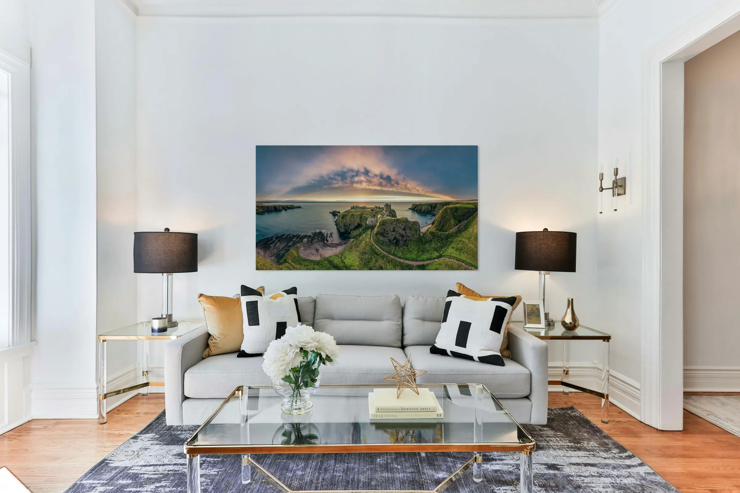 An aerial view of Dunnottar Castle at sunrise, showcasing its dramatic perch on the Aberdeenshire coastline. The warm glow of sunrise illuminates the clouds arcing gracefully over the castle, adding a sense of grandeur to the scene. Below, the winding path to the castle invites the viewer into this historic landscape, where the meeting of natural beauty and human history is undeniable. A great photograph for those captivated by Scotland’s rich heritage and striking coastal scenery.