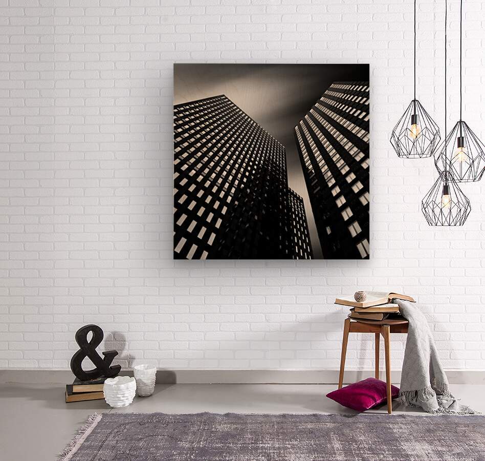 A monochrome long exposure photograph capturing a semi-abstract view looking up between three towering high-rise buildings in Amsterdam, Netherlands. The dramatic contrast and extended exposure time highlight the geometric forms and architectural lines of the skyscrapers, creating a striking visual effect. The use of black and white enhances the abstract quality of the composition, emphasizing the interplay of light and shadow. Ideal for modern decor or architectural art collections.