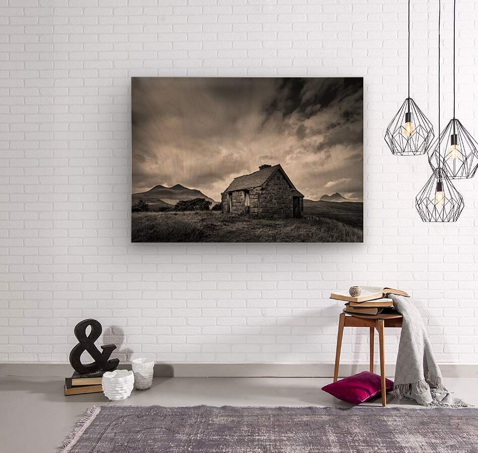 An abandoned Highland bothy stands alone in the rugged landscape of Sutherland, Scotland, with the distant silhouettes of Cul Mor and Suilven rising against the horizon. Overhead, dramatic clouds add a sense of atmosphere and isolation. A great photograph for those who appreciate the untamed beauty of Scotland’s wilderness.