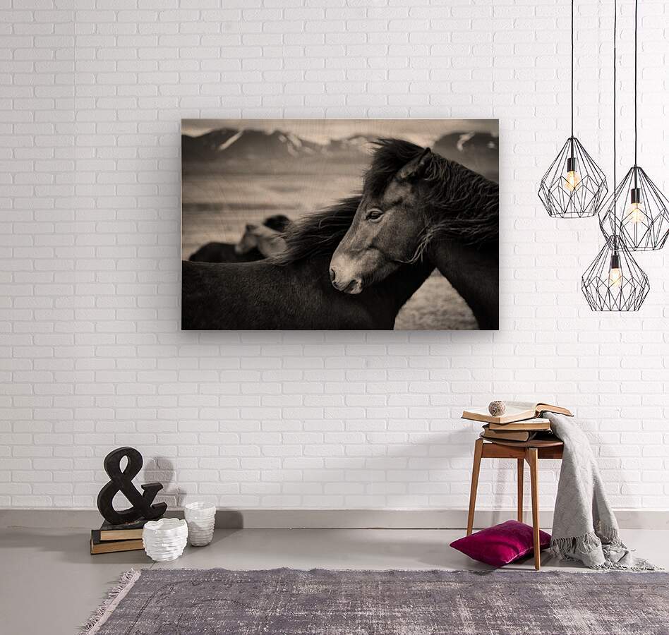 A monochrome photograph capturing Icelandic horses huddled together on a windy day, showcasing their resilience and companionship in a rugged, natural setting. The image highlights the majestic Icelandic horses' unique features and their interaction against a backdrop of dramatic mountains. A great photograph for those interested in Icelandic horses in their natural habitat, capturing the essence of their rugged beauty and the raw, atmospheric conditions they endure.