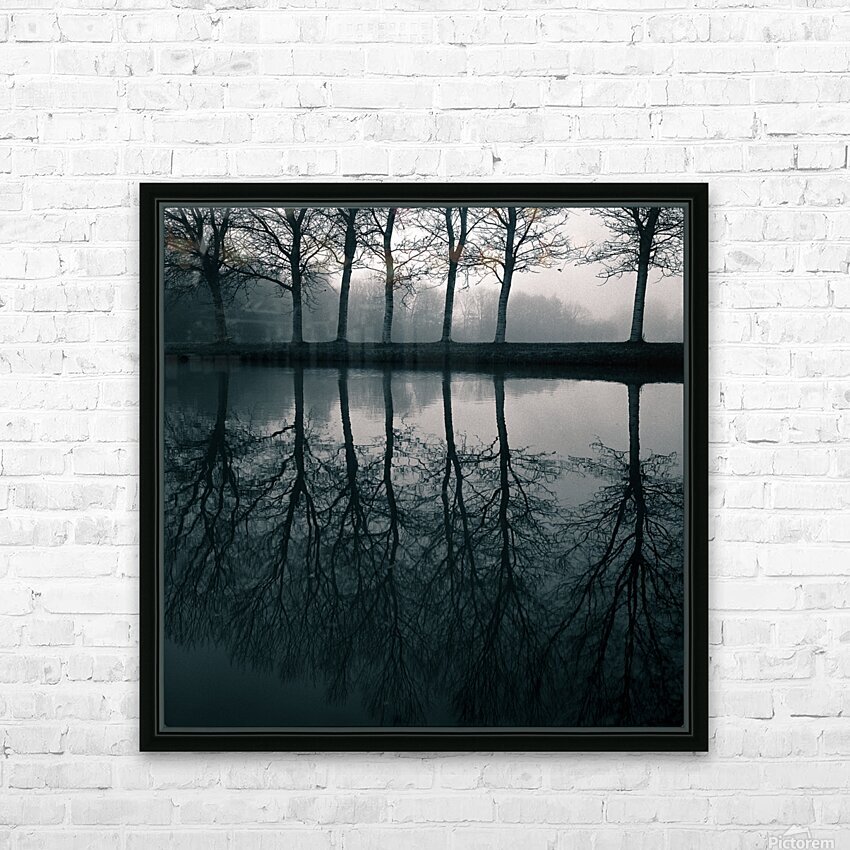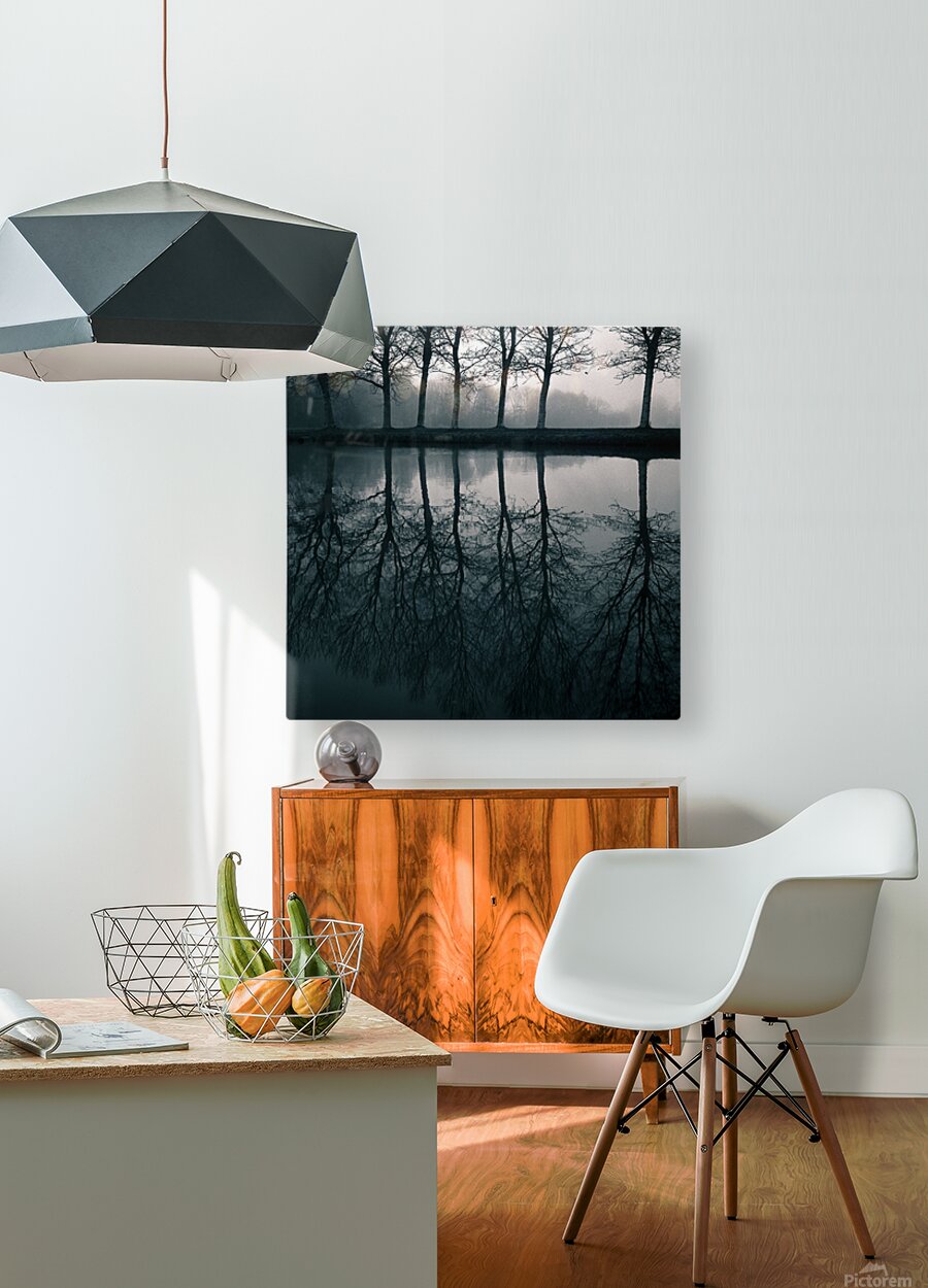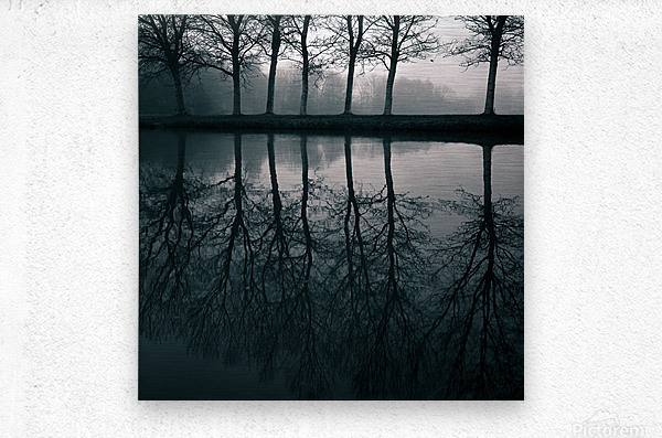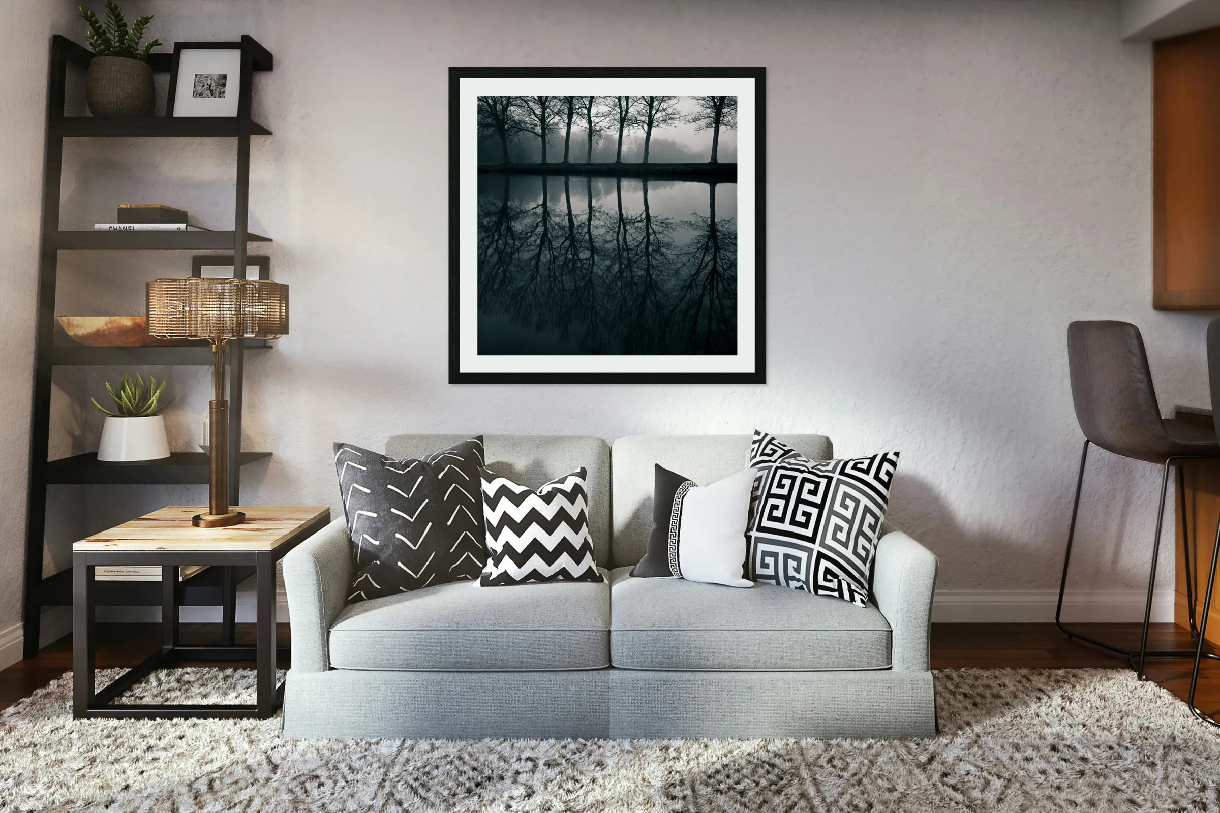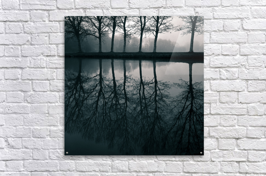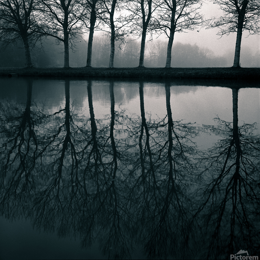 Winter trees stand quietly reflected in the still waters of a pond on a misty day in Wilhelminapark, Rijswijk, Netherlands. The soft fog blurs the edges of bare branches, creating a serene and almost dreamlike atmosphere in this peaceful park setting. Wilhelminapark is a historic green space in Rijswijk known for its tranquil ponds, mature trees, and seasonal beauty. In winter, the park transforms into a quiet retreat where nature’s stillness is amplified by fog and frost, inviting contemplation and calm. This monochrome photograph is perfect for lovers of peaceful landscapes and minimalist nature scenes. A calming addition to any interior, it is available as wall art and a wide range of other product formats.