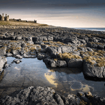 A long exposure photograph of Dunstanburgh Castle in Northumberland, captured at dawn with a tranquil rock pool in the foreground and the historic cas...[+]