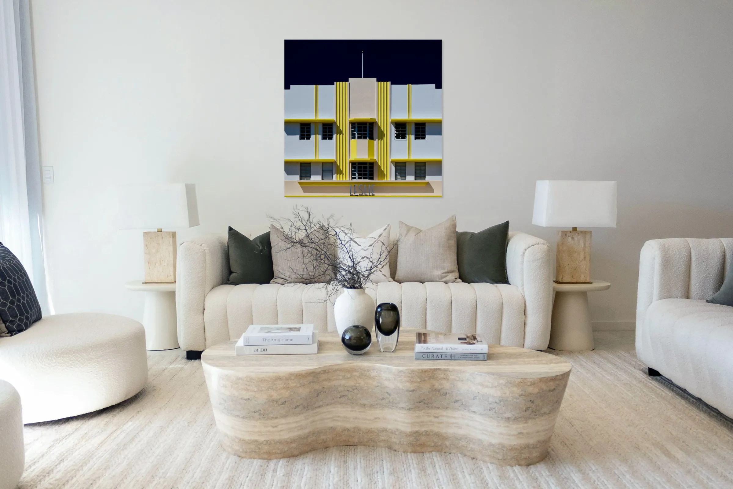 A semi-abstract study of the iconic art deco facade of the Leslie Hotel in Miami Beach, Florida, USA. This photograph captures the distinct architectural elements and vibrant details of one of Miami Beach's renowned historic buildings. Featuring the unique geometric patterns and pastel colors typical of the art deco style, this image provides a contemporary twist on a classic design. The ideal photograph for art enthusiasts, architecture aficionados, or anyone interested in capturing the essence of Miami's architectural heritage.