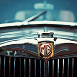 The MG badge and chrome front grill of a classic MG TF motor car.
