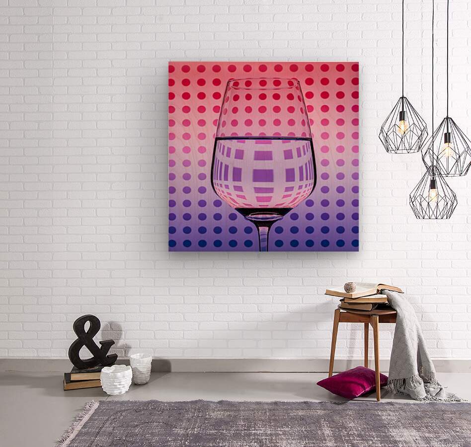 A still life photograph featuring a wine glass with a pattern of circles behind it on a shaded blue and red background. The glass is half full of water, creating a visual effect where the circles seem to transform into squares through the refracted light. The ideal photograph for art collectors, designers, and anyone looking to add a unique and visually intriguing piece to their collection.