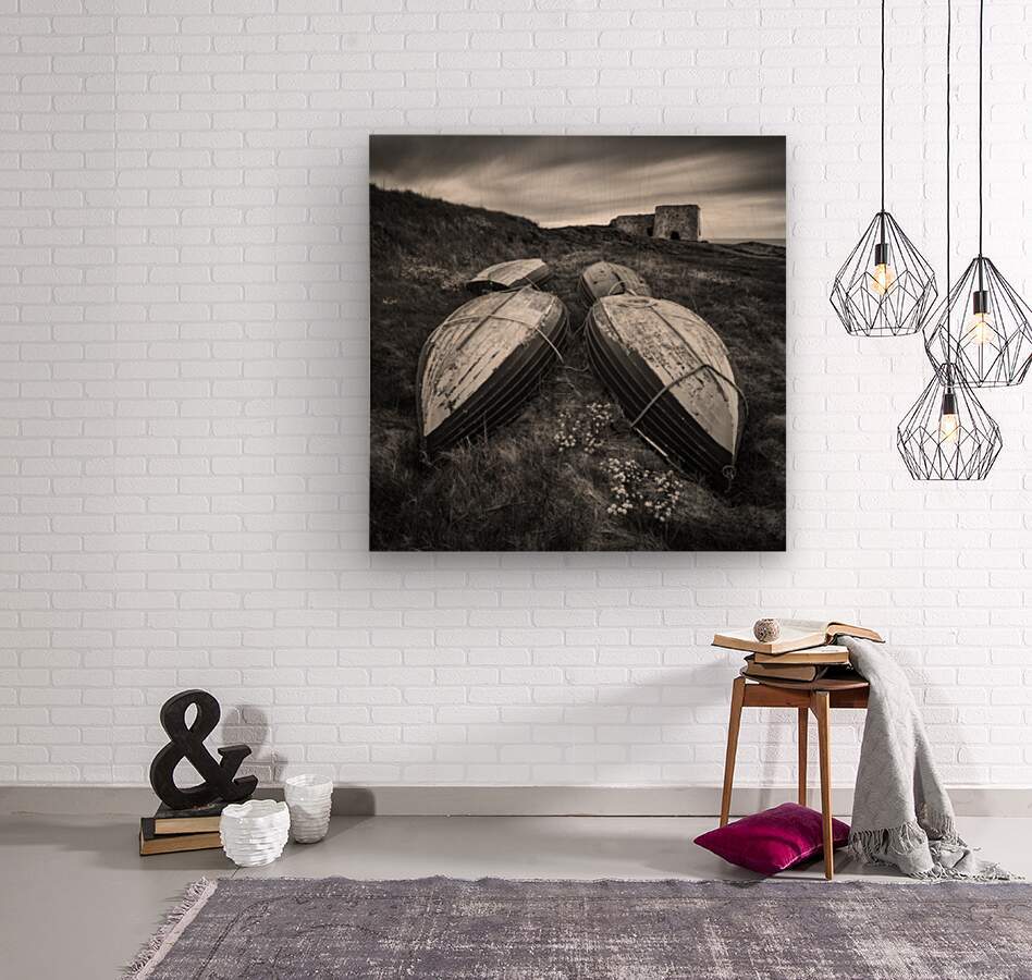 A black and white long exposure photograph showcasing four upturned fishing boats resting at Boddin Point, Angus, Scotland. Overhead, streaking clouds create a dynamic contrast against the stillness of the scene, while the weathered limekiln in the background adds a sense of history and abandonment. A perfect photograph for history enthusiasts or collectors of atmospheric seascape imagery.