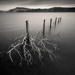 A tree branch stuck on a wire fence on the shore of Loch Avich, Scotland, UK.