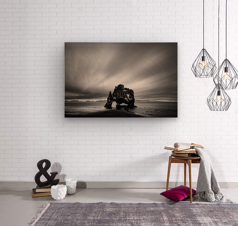 A monochrome, long exposure photograph of Hvitserkur, also known as Thirsty Dragon Rock, captured on an overcast day in Iceland. The black and white t...[+]