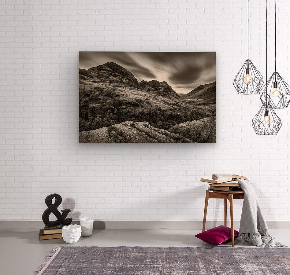 A monochrome long exposure photograph capturing The Three Sisters mountain range in Glencoe Scotland with dynamic cloud movement overhead. This striki...[+]