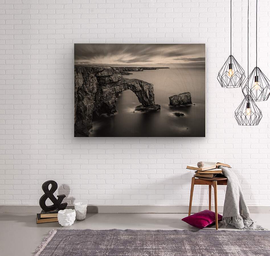 A long exposure photograph of the Green Bridge of Wales, presented in monochrome, showcasing a natural sea arch formed from Carboniferous Limestone. L...[+]