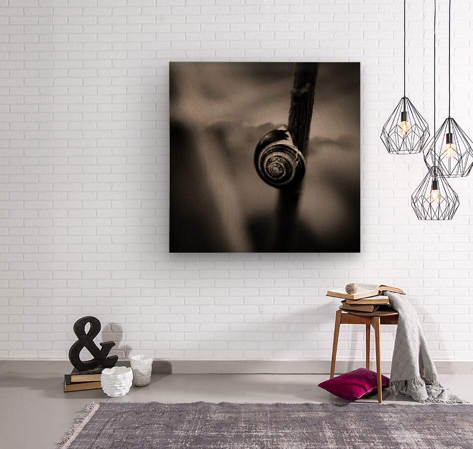 A monochrome photograph of a small snail perched on the stem of a plant in woodland set against a dark backdrop that softly blurs the surrounding elements. The image features a slight warm tone and grainy texture capturing the fine art style. The ideal photograph for nature lovers and those who appreciate detailed atmospheric fine art images.
