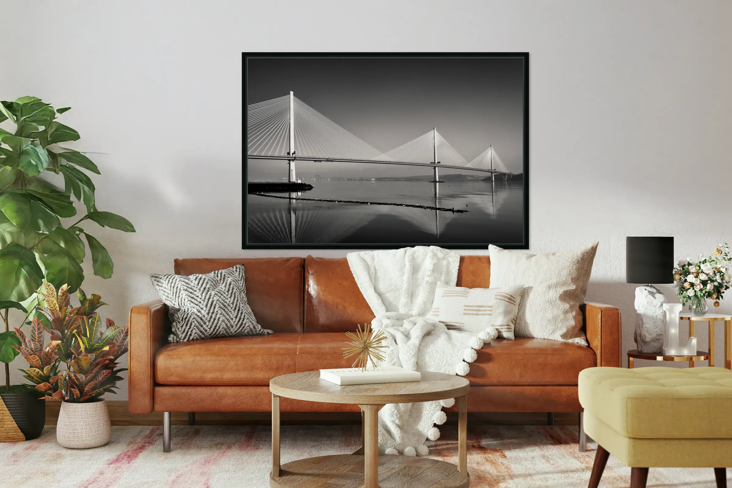 A monochrome photograph highlighting the three towering suspension pillars of the Queensferry Crossing the modern Forth Road Bridge at Queensferry Scotland. The clean lines and striking symmetry of the structure create a sense of strength and elegance. A great photograph for those who admire contemporary engineering and architectural design.